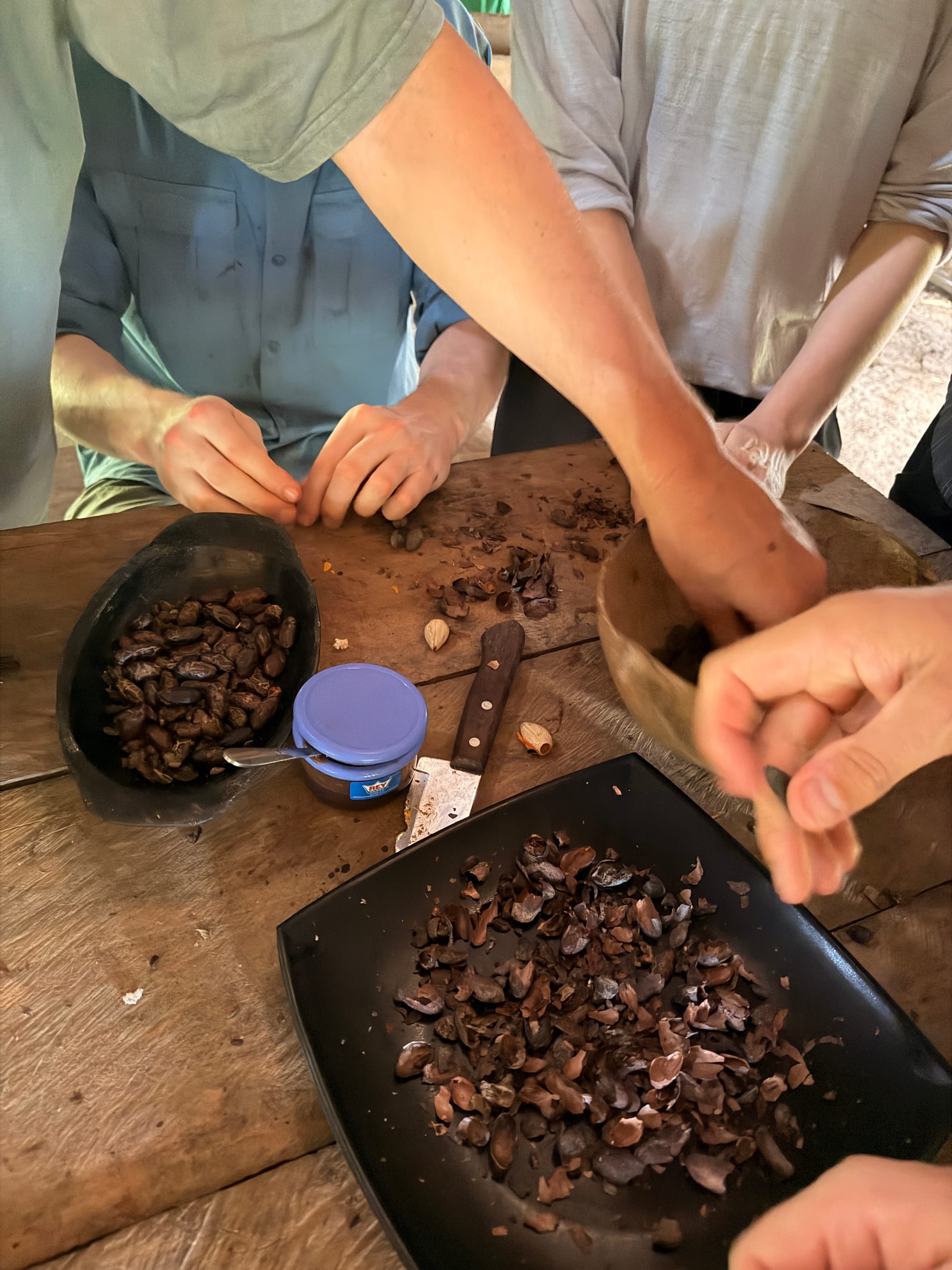 We then had a huge feast. We were shown different fruits and snacks, which the locals eat and were taught how to make bread out of yuca (cassava root). We learnt the whole process, from pulling the ingredients out of the ground, grating, straining and sieving the yuca, to finally cooking the bread. We had this bread with our lunch before learning how to make chocolate from scratch from cacao beans. This village experience cost us $15 USD each on top of the tour, $5 USD went to the Shaman and $10 went to the village for providing us with a whole day of activities and food.