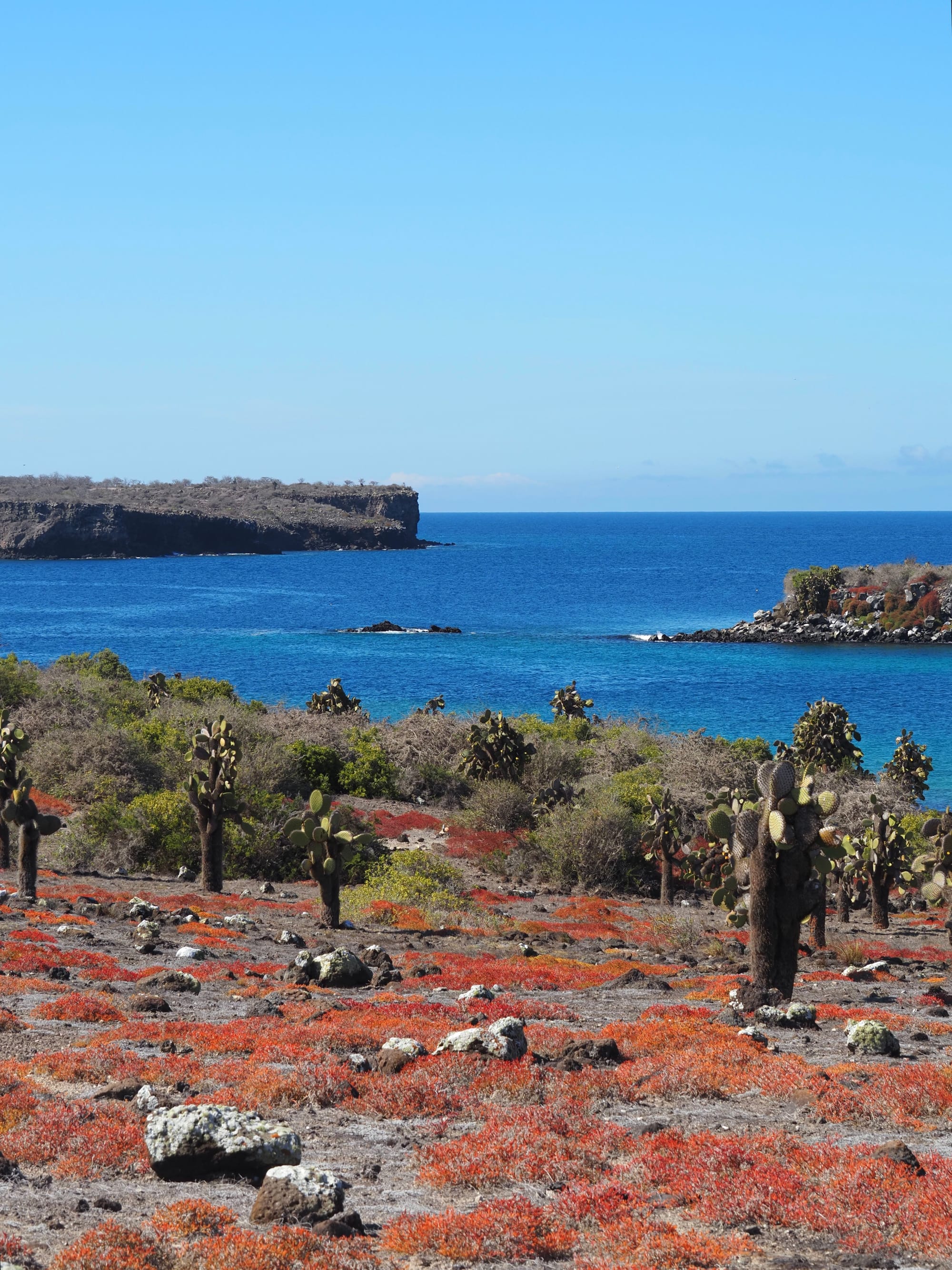 After lunch we went for our second walk around South Plaza Island, which was the most colourful island we had seen. Full of green cactuses and bright red/orange ground flora contrasting with the blue sea, this was one of our favourite hikes. Once back on the boat we sailed towards Santiago, spotting more wildlife along the way before another delicious meal.