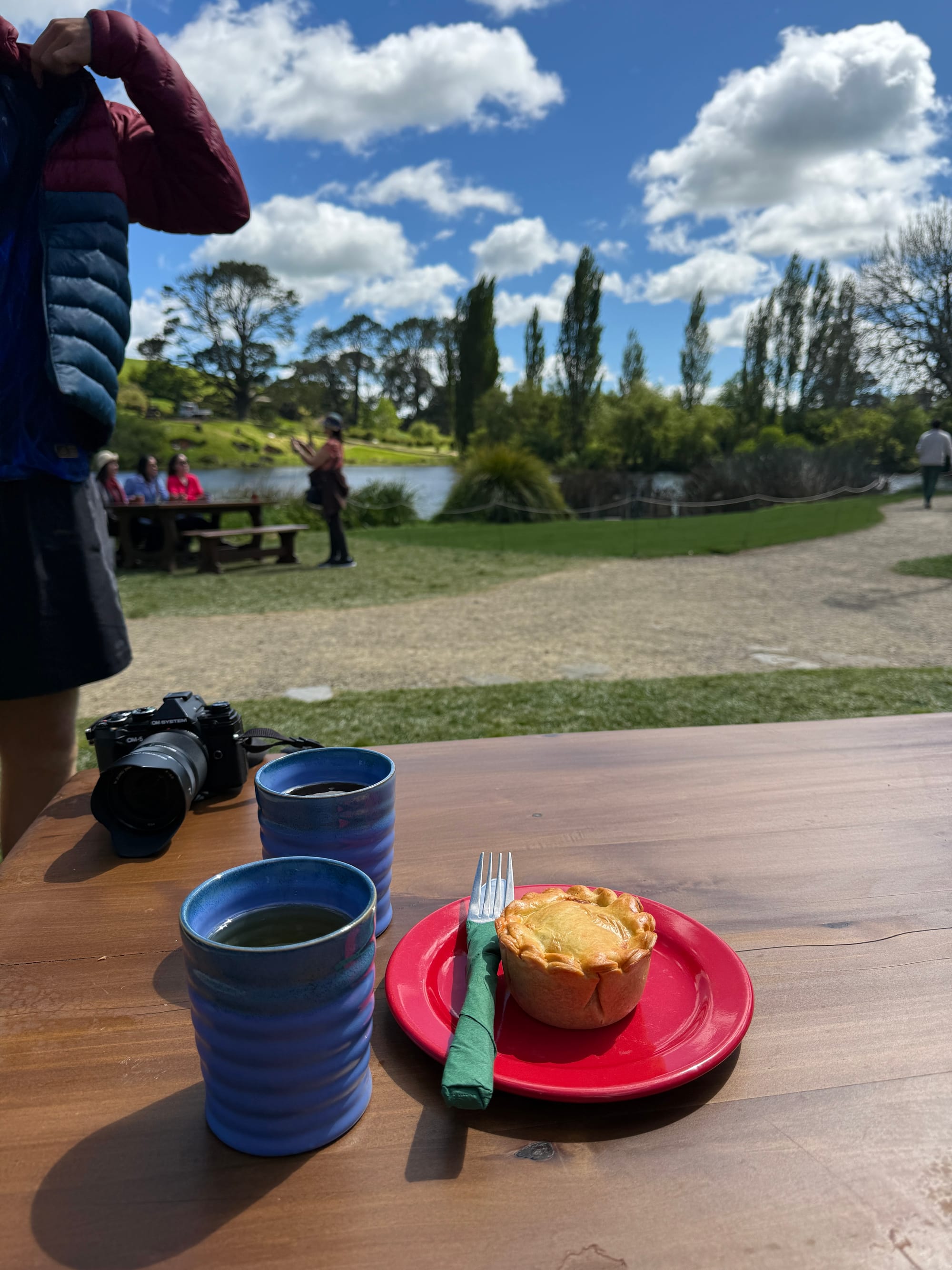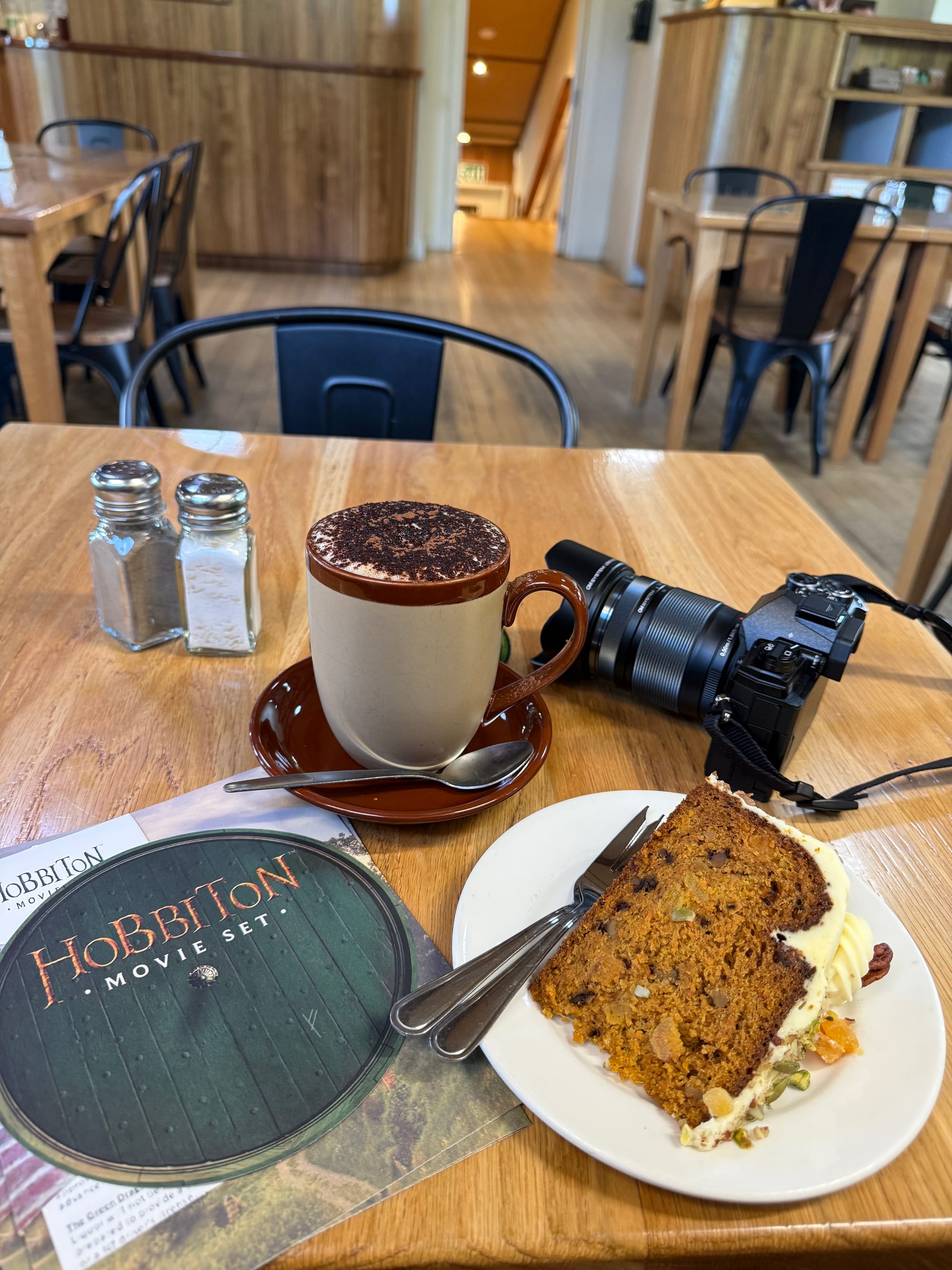 We were travelling in our camper-van relocation, so getting to Hobbiton was easy and there is ample parking available. If you do not have your own transport, you can easily book a return bus trip from Auckland or the surrounding smaller towns also offer shuttles. Once we arrived, we enjoyed the surrounding scenery of rolling green hills dotted with Merino lambs, with a coffee and a slice of carrot cake at the LotR’s themed cafe, before getting onto our tour bus.