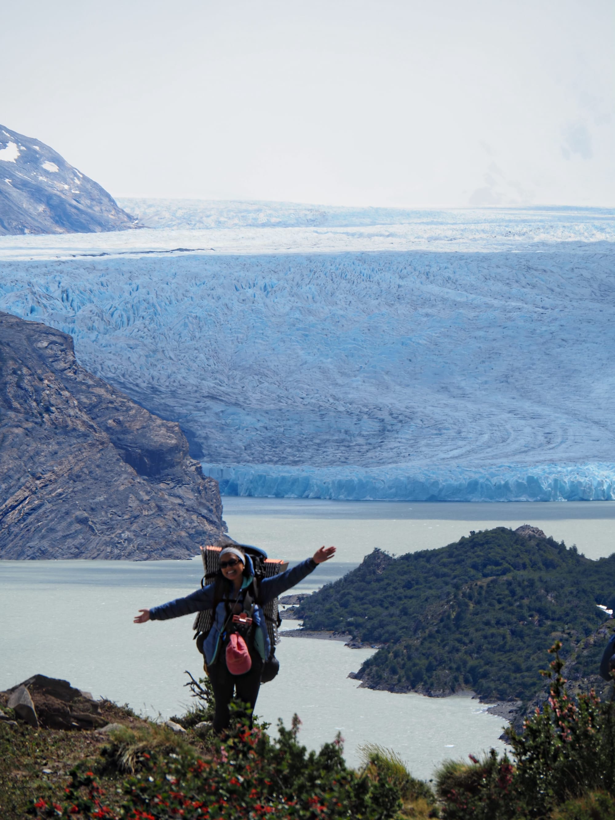 Once we arrived at Paine Grande, we started our first hike up to Refugio Grey, where our first nights stay was. It is 11km up to Grey, but we stopped off at Mirador Grey Lookout at 5.7km for a break and to see the gorgeous view of the glacier from afar. As our first hike of the trek, it wasn’t bad at all! There were quite a few steep parts, a lot of steps, and it was pretty windy, however, we were incredibly lucky with the weather! Even though it wasn’t clear blue skies, and there were a few clouds, when the sun shone through, it lit up the whole landscape and made the surrounding mountains and glacier shine. It took us around 4.5 hours to get to Grey, with a few snack breaks and lunch in between.