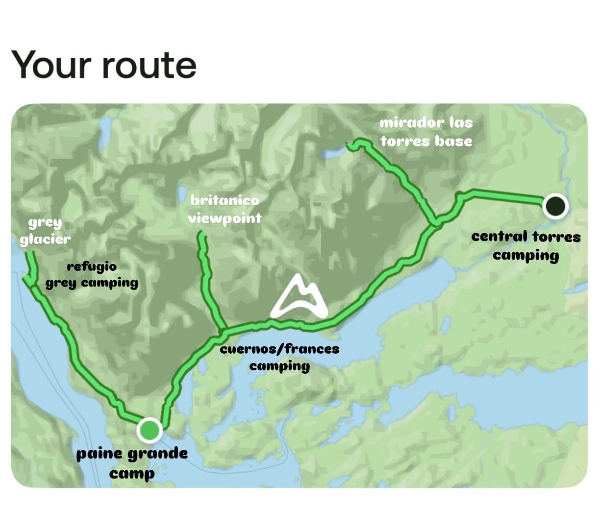 The route of the trek takes the shape of a W when you visit the three main highlights, Grey Glacier, Britaníco and the Torres Towers (seen below). The O-Trek is the more advanced hike, which can take up to 8 days to complete, and connects the two sides of the W together into an O shape.