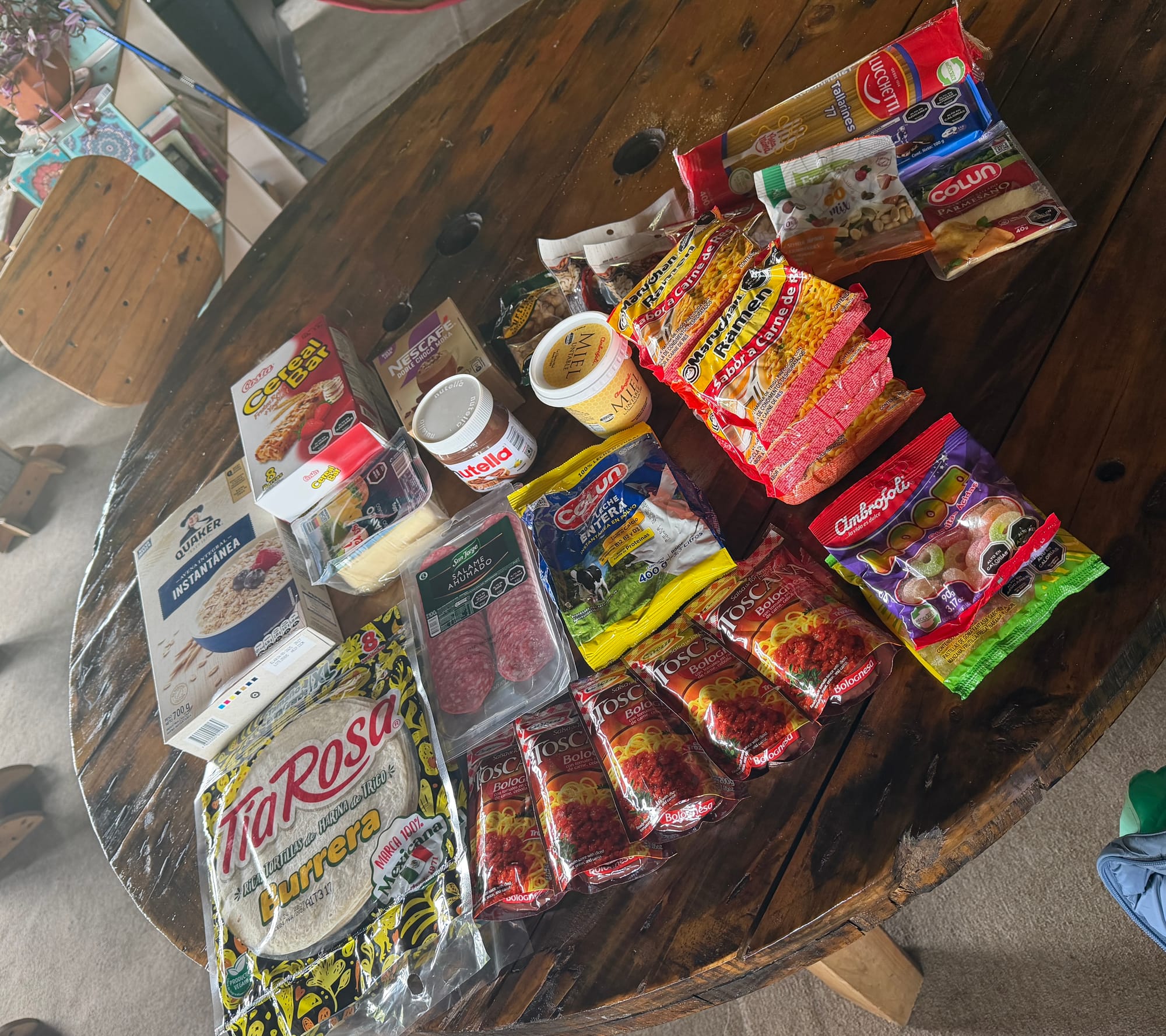 - Snacks: Trail mix (we bought different nuts and dried fruits and combined them), chocolate, sweets, cereal bars, Nutella and extra wraps for dessert.